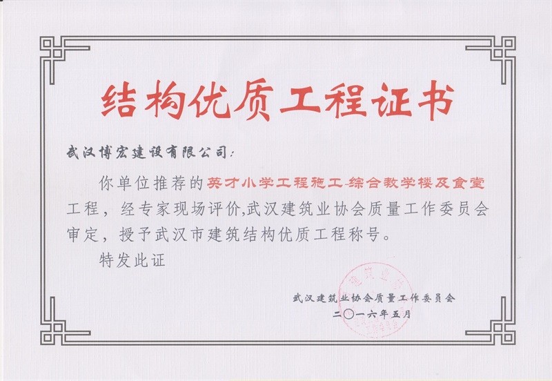 英才小學(xué)-教學(xué)綜合樓結(jié)構(gòu)優(yōu)質(zhì)工程證書
