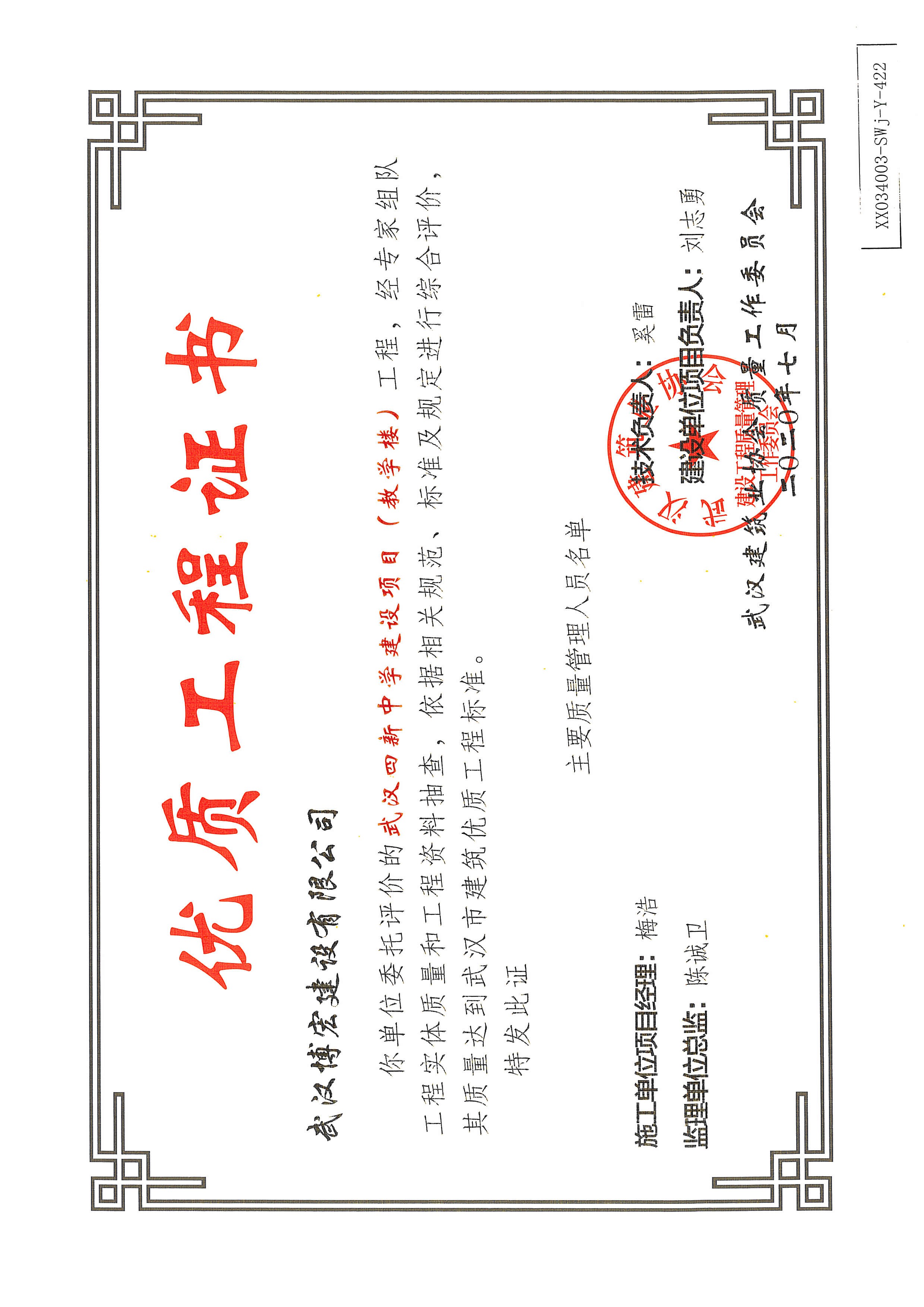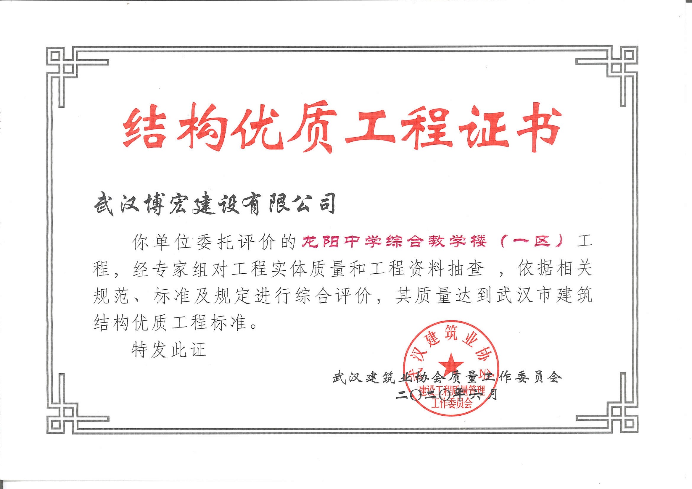 優(yōu)質(zhì)工程證書(shū)(武漢四新中學(xué)建設(shè)項(xiàng)目(教學(xué)樓)