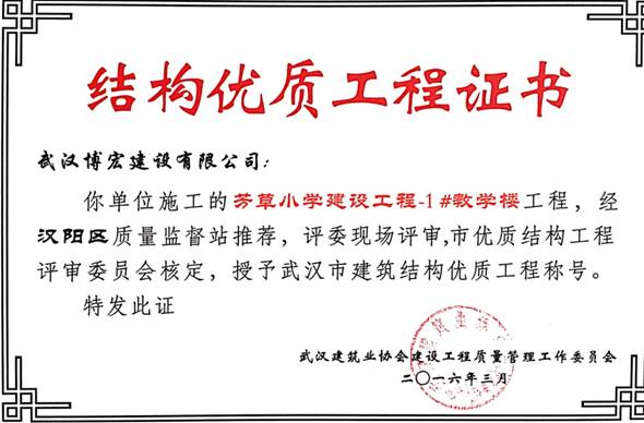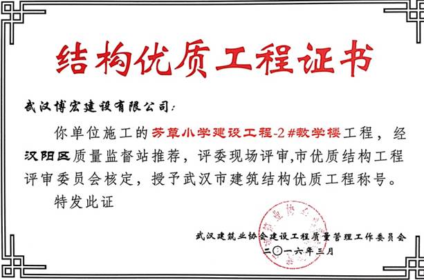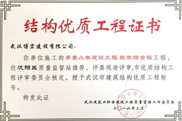 我單位施工的芳草小學(xué)建設(shè)工程(芳草路與四新北路交匯處西北角)1#教學(xué)樓、2#教學(xué)樓、教學(xué)綜合樓工程,經(jīng)漢陽區(qū)建筑管理站推薦,評委現(xiàn)場評審,武漢建筑業(yè)協(xié)會建設(shè)工程質(zhì)量管理工作委員會核定,授予武漢市建筑結(jié)構(gòu)優(yōu)質(zhì)工程稱號。