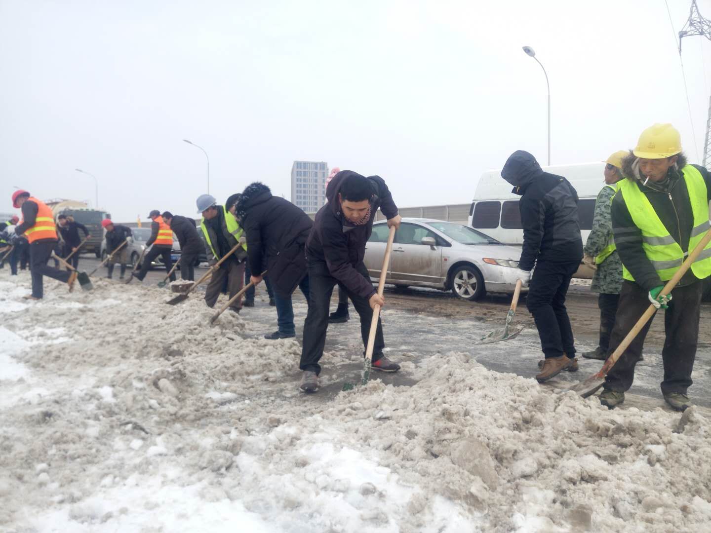 1月28日,公司廣大職工不畏低溫嚴(yán)寒,來到三環(huán)線(龍陽大道~漢陽大道)路段,繼續(xù)奮戰(zhàn),男女齊上陣。期間,漢陽區(qū)委書記馬澤江、集團(tuán)公司董事長(zhǎng)嚴(yán)悌文等領(lǐng)導(dǎo)來到現(xiàn)場(chǎng)指揮工作,為廣大建設(shè)者鼓勁兒加油,下午2點(diǎn),基本完成主干道清掃,車輛予以通行,截至5點(diǎn),徹底完成三環(huán)線(龍陽大道~漢陽大道)路段的積雪清掃工作。隨后,鏟雪隊(duì)伍搶抓時(shí)間,來不及休息便再一次來到琴臺(tái)大道對(duì)昨夜的積雪進(jìn)行二次清除,進(jìn)一步拓寬快車道,下午6點(diǎn)30分完成拓寬任務(wù)。