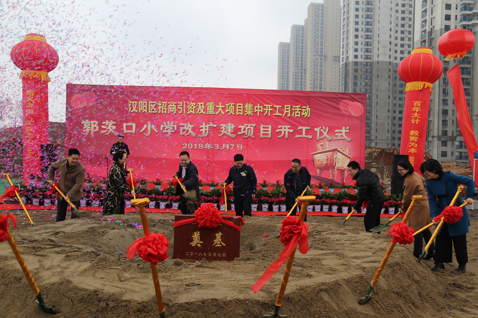 莫道春來早,更有早行人。2018年3月7日上午,漢陽區(qū)招商引資重大項目集中開工活動走進郭茨口小學改擴建項目。漢陽區(qū)委書記馬澤江,區(qū)長閻磊,區(qū)政協(xié)主席張本滿,區(qū)人大副主任黃學真,副區(qū)長蔡松、胡勇、皮惠蘭,區(qū)教育局局長施慧芳,漢陽市政總經(jīng)理虞志鵬、副總經(jīng)理王智高,天創(chuàng)房地產(chǎn)總經(jīng)理張琴,博宏建設董事長錢濤等蒞臨開工儀式現(xiàn)場。