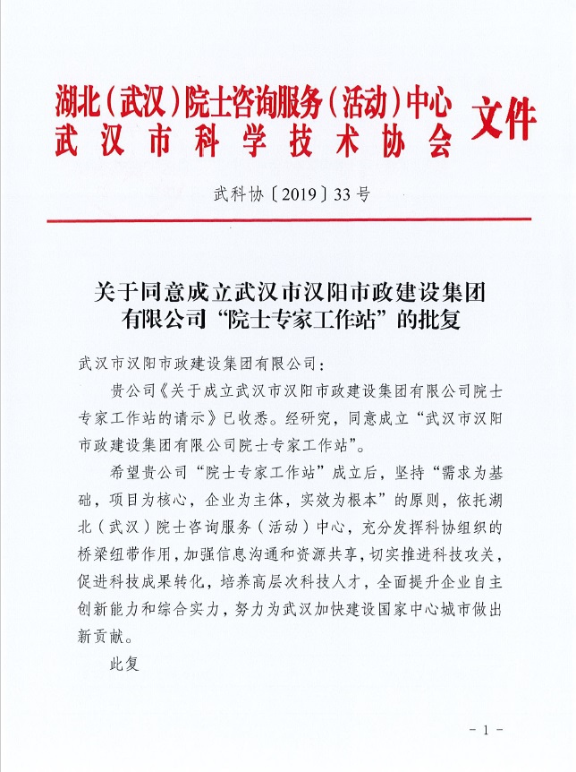 2019年5月20日,湖北(武漢)院士咨詢服務(wù)(活動)中心、武漢市科學(xué)技術(shù)協(xié)會正式批復(fù)同意成立武漢市漢陽市政建設(shè)集團有限公司院士專家工作站。