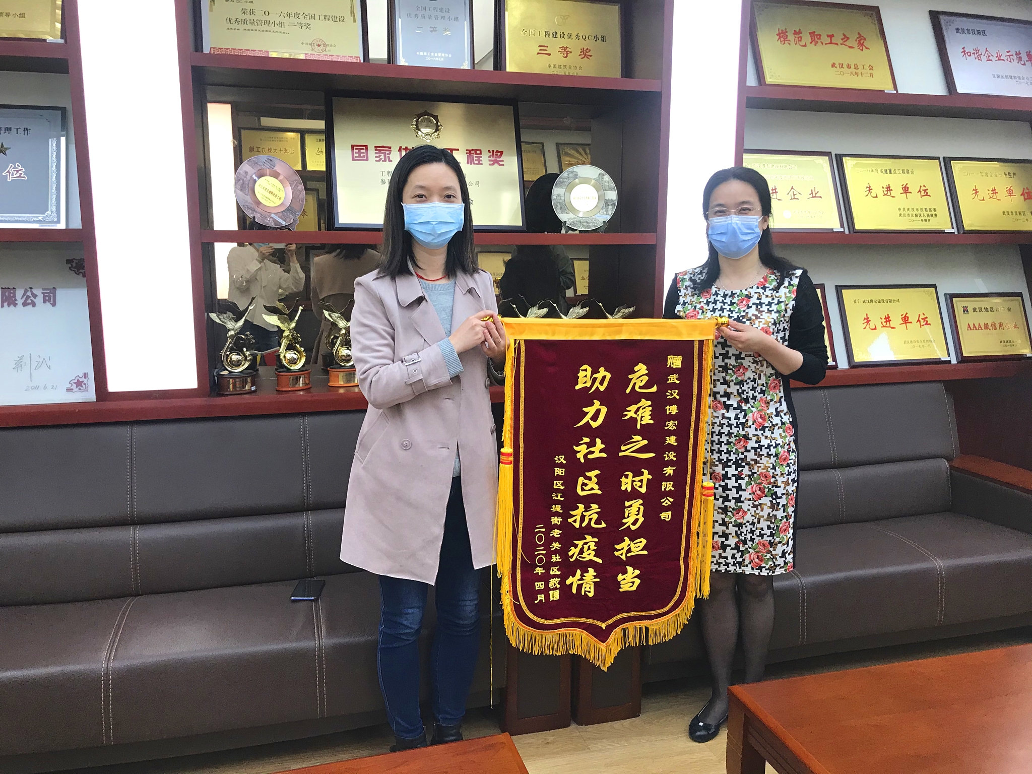 4月27日上午,武漢市漢陽區(qū)江堤街老關社區(qū)書記馮霞懷著一份感恩的心,將一面印有“危難之時勇?lián)?,助力社區(qū)抗疫情”的錦旗送到博宏建設支部副書記郭一清的手中,感謝博宏建設在疫情期間主動為社區(qū)提供生活保障物資的善舉。