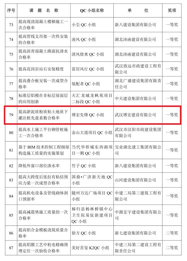 每年,公司都根據(jù)各大在建項目的實際情況,針對生產(chǎn)中的難題,從挖潛增效、強化管理等角度確定課題,成立相關(guān)技術(shù)攻關(guān)小組,構(gòu)思切實可行的質(zhì)量提升措施,并邀請技術(shù)專家對其進行指導(dǎo)完善。本次獲得一等獎的《提高淤泥質(zhì)粉質(zhì)粘土地質(zhì)下灌注樁充盈系數(shù)合格率》,在其攻關(guān)過程中,“博宏先鋒 QC 小組”制定了嚴格的工作計劃和科學(xué)的攻關(guān)流程,按月推進,最終形成了一套可復(fù)制、可推廣的工作經(jīng)驗,攻關(guān)小組也通過QC活動掌握了一套提升項目管理質(zhì)量的方法論。