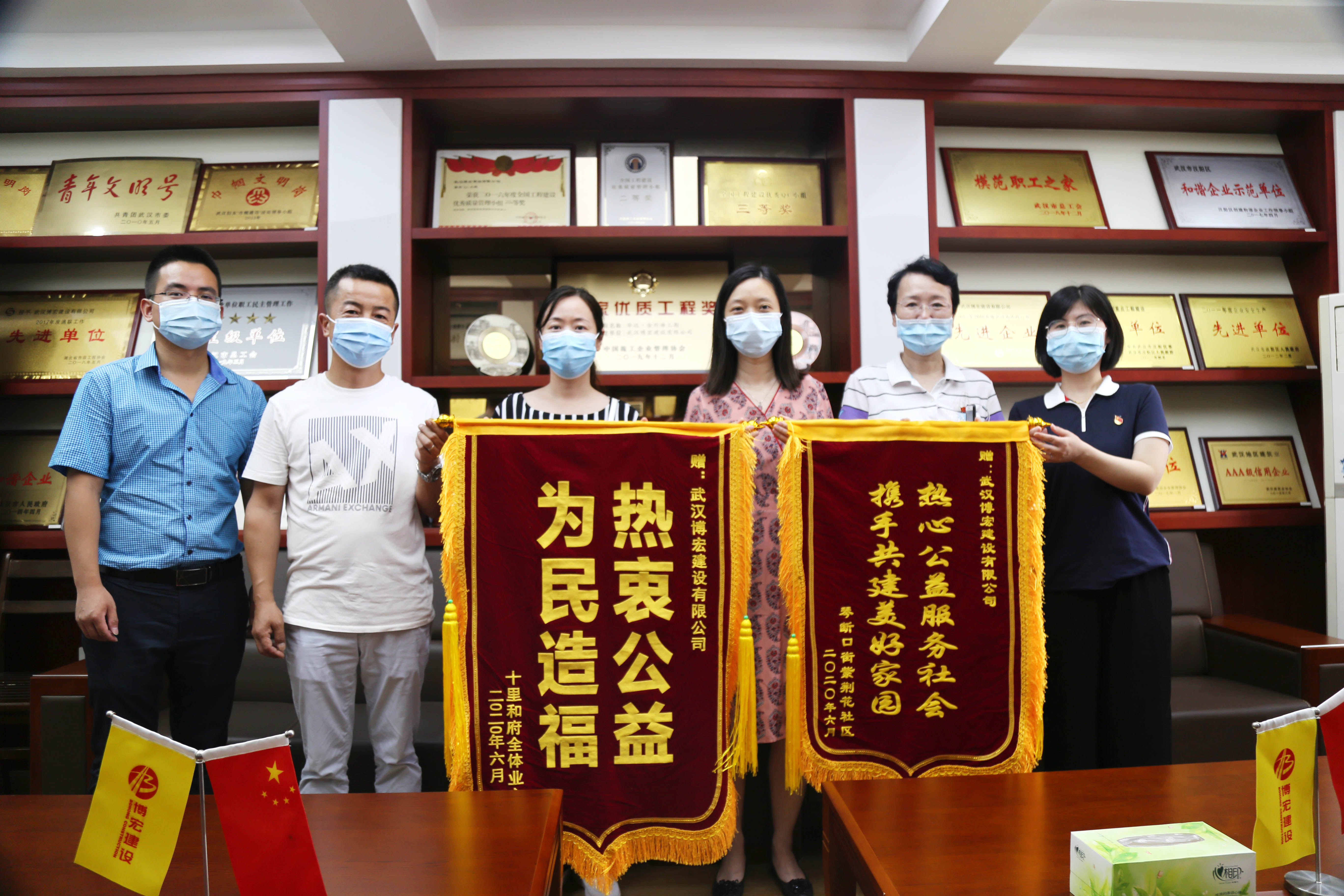?? 6月9日上午,漢陽(yáng)區(qū)委宣傳部代表和漢陽(yáng)區(qū)紫荊花社區(qū)、十里和府小區(qū)物業(yè)代表結(jié)伴而來(lái),為博宏建設(shè)送來(lái)兩面錦旗,感謝博宏建設(shè)在改善社區(qū)工作環(huán)境,服務(wù)社區(qū)公益事業(yè)中做出的努力。據(jù)悉,十里和府小區(qū)一號(hào)樓一樓裝修老舊,地面不平,居民出行不便,博宏建設(shè)裝飾裝修項(xiàng)目部在周邊施工時(shí),接到相關(guān)指示,先后派出6人歷時(shí)6天,一并對(duì)該區(qū)域近300平米進(jìn)行了地磚更換,裝修效果得到了居民和社區(qū)的高度認(rèn)可。