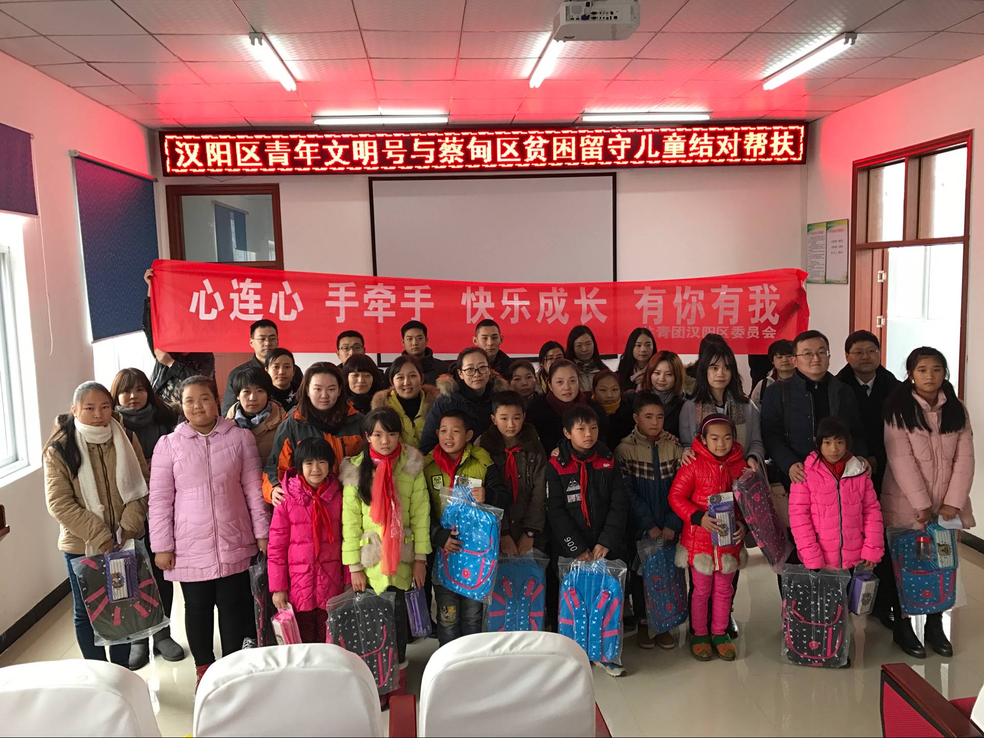 11月24日,為認(rèn)真落實共青團(tuán)助力脫貧攻堅電視電話會議精神,根據(jù)“關(guān)愛留守兒童,助力精準(zhǔn)扶貧”行動整體安排,漢陽團(tuán)區(qū)委組織全區(qū)20個市級以上青年文明號單位赴蔡甸區(qū)消泗鄉(xiāng),集中慰問幫扶貧困留守兒童,并進(jìn)行現(xiàn)場結(jié)對,我公司參與了此次慰問幫扶活動。