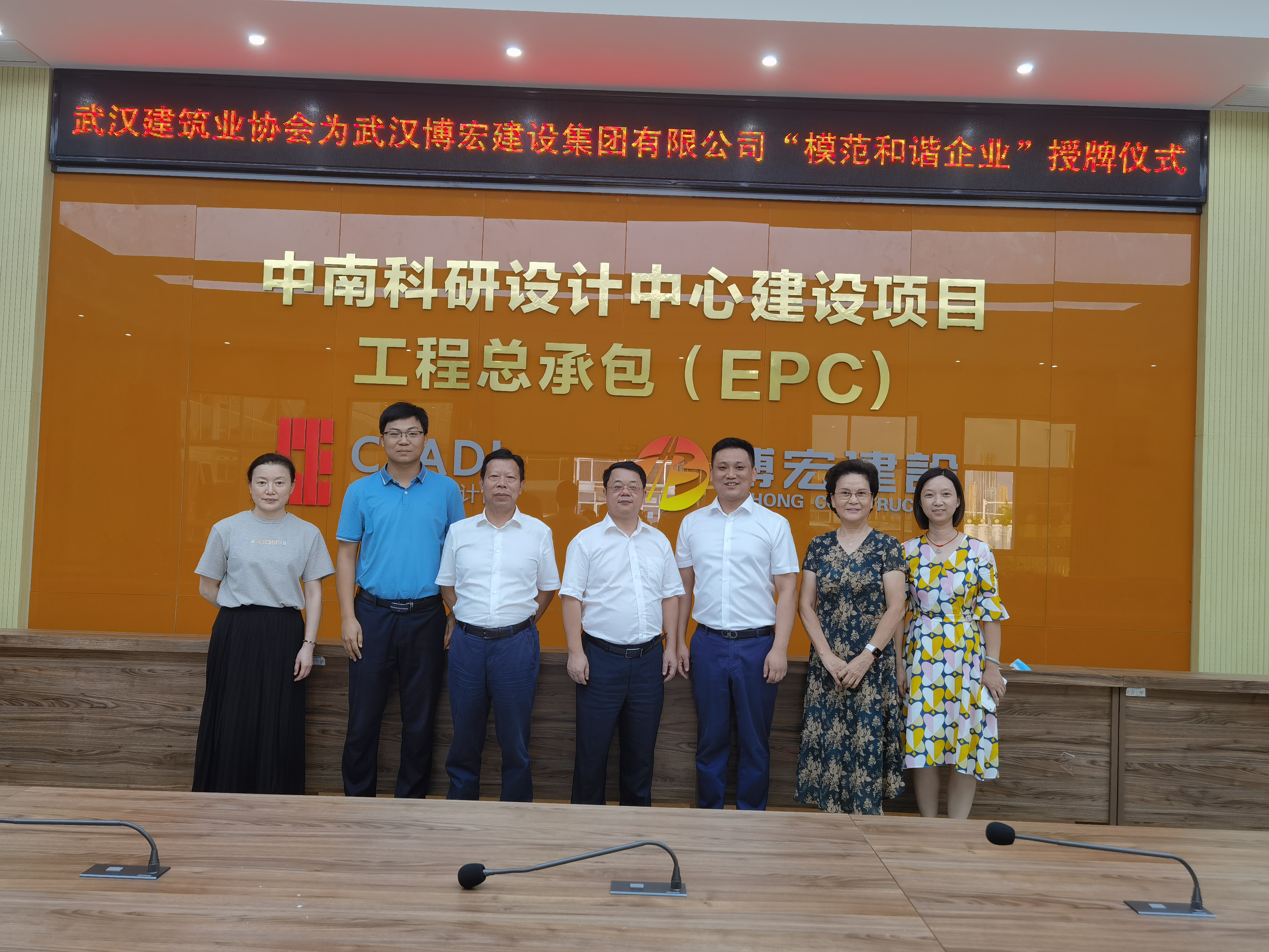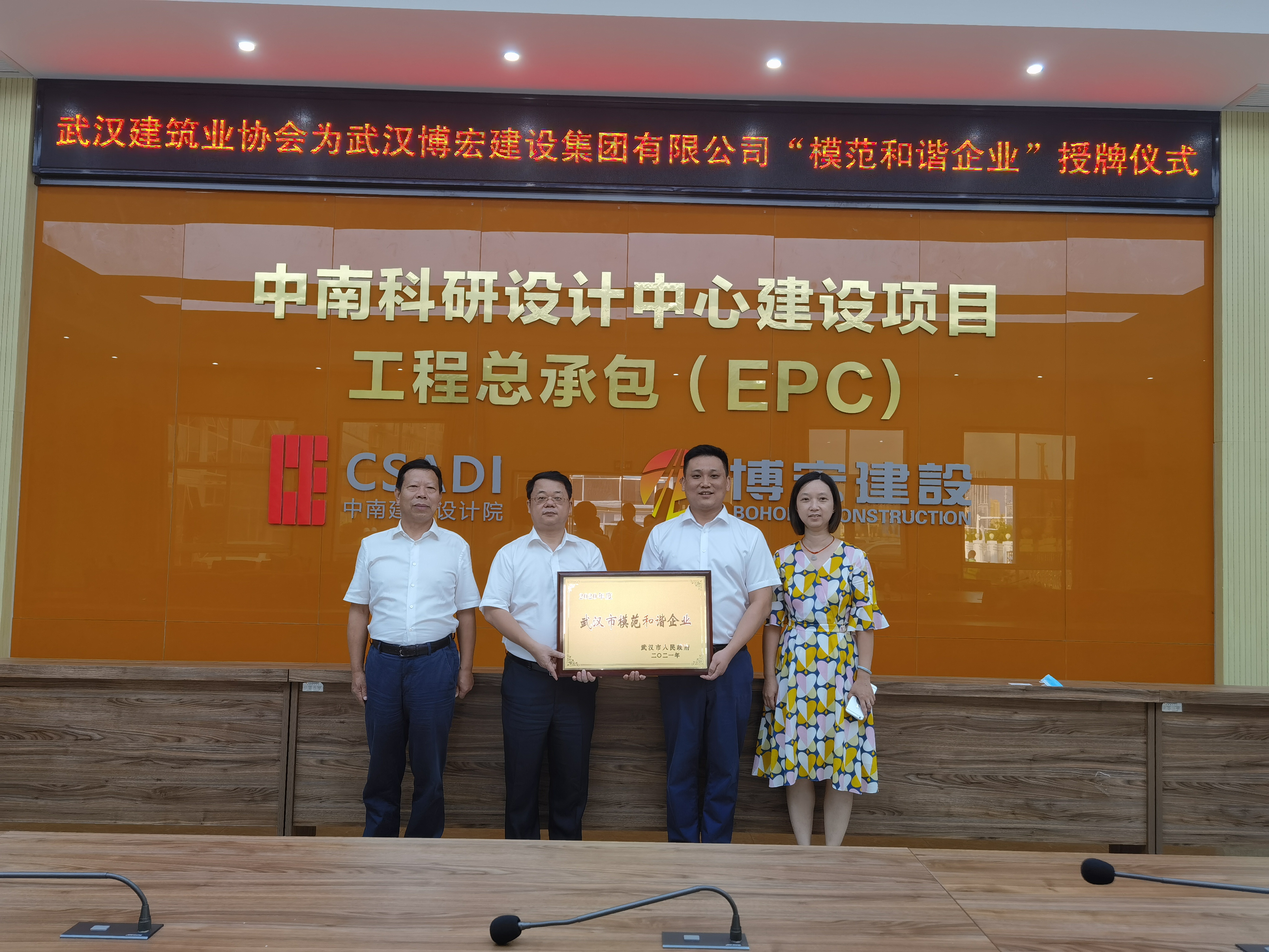 9月14日下午,博宏建設(shè)“武漢市模范和諧企業(yè)”授牌儀式在博宏建設(shè)承建的中南科研設(shè)計中心項目順利舉行。武漢建筑業(yè)協(xié)會副會長劉慶、秘書長李紅青、總工程師工作委員會副主任安維紅,博宏建設(shè)總經(jīng)理蘇琦、黨支部副書記郭一清、總經(jīng)理助理周昌文參加儀式。