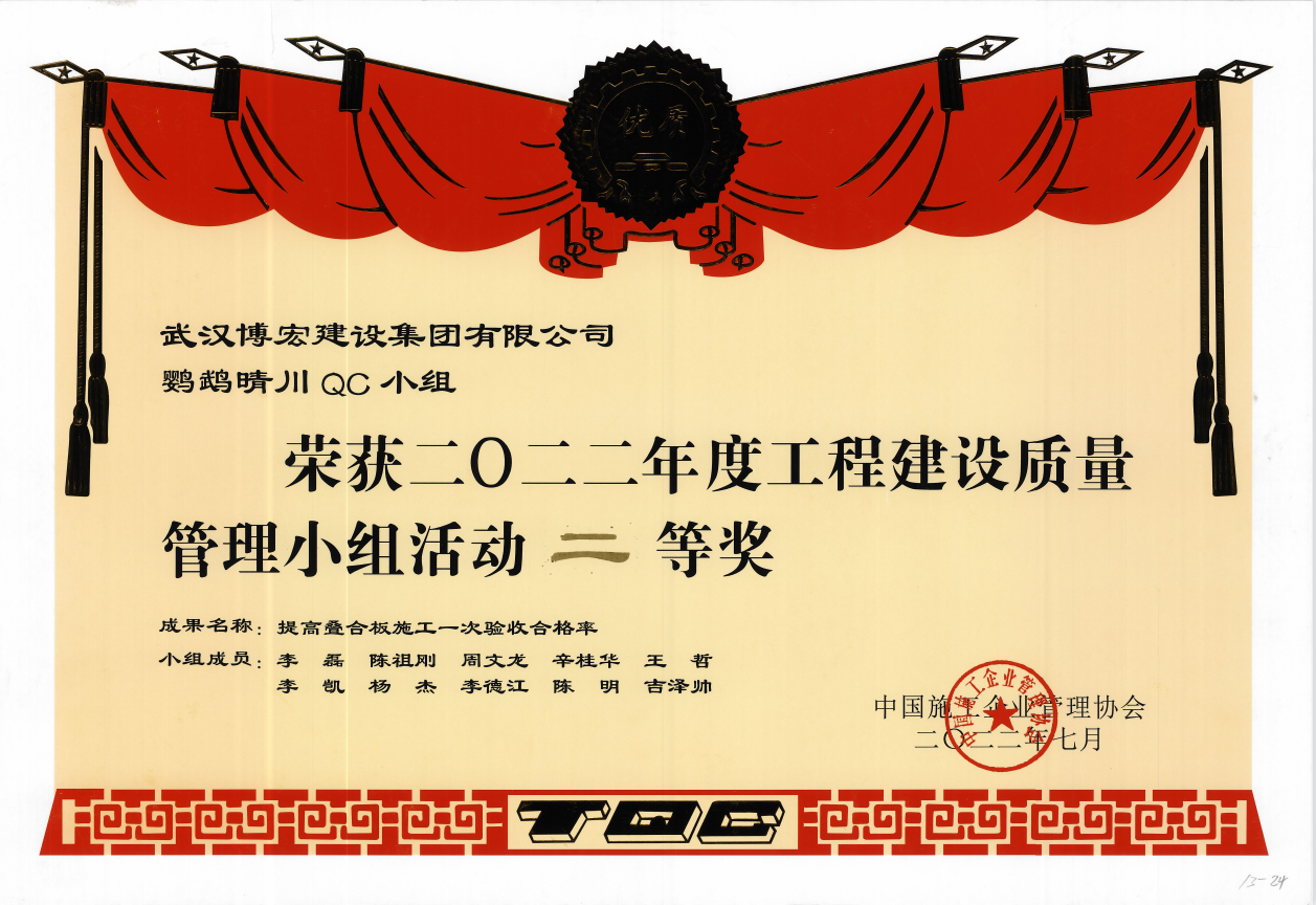 近日,由中國施工企業(yè)管理協(xié)會(huì)主辦的“2022年工程建設(shè)質(zhì)量管理小組競賽活動(dòng)復(fù)賽和決賽”已圓滿結(jié)束,由我司報(bào)送的4項(xiàng)成果經(jīng)歷層層角逐,在全國1113個(gè)成果中脫穎而出。其中博宏先鋒QC小組的代表成果《提高金剛砂地坪一次驗(yàn)收合格率》榮獲一等獎(jiǎng)、芳草云天QC小組的代表成果《地下室外墻單側(cè)支模體系研制》與鸚鵡晴川QC小組的代表成果《提高疊合板施工一次驗(yàn)收合格率》榮獲二等獎(jiǎng)、博宏機(jī)電之星QC小組的代表成果《提高消防噴淋頭安裝定位準(zhǔn)確率》榮獲三等獎(jiǎng),博宏建設(shè)集團(tuán)QC成果再次取得重大突破!