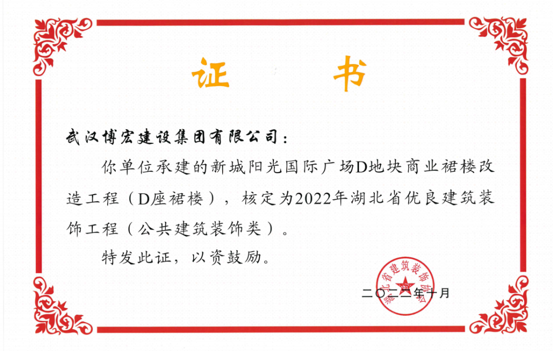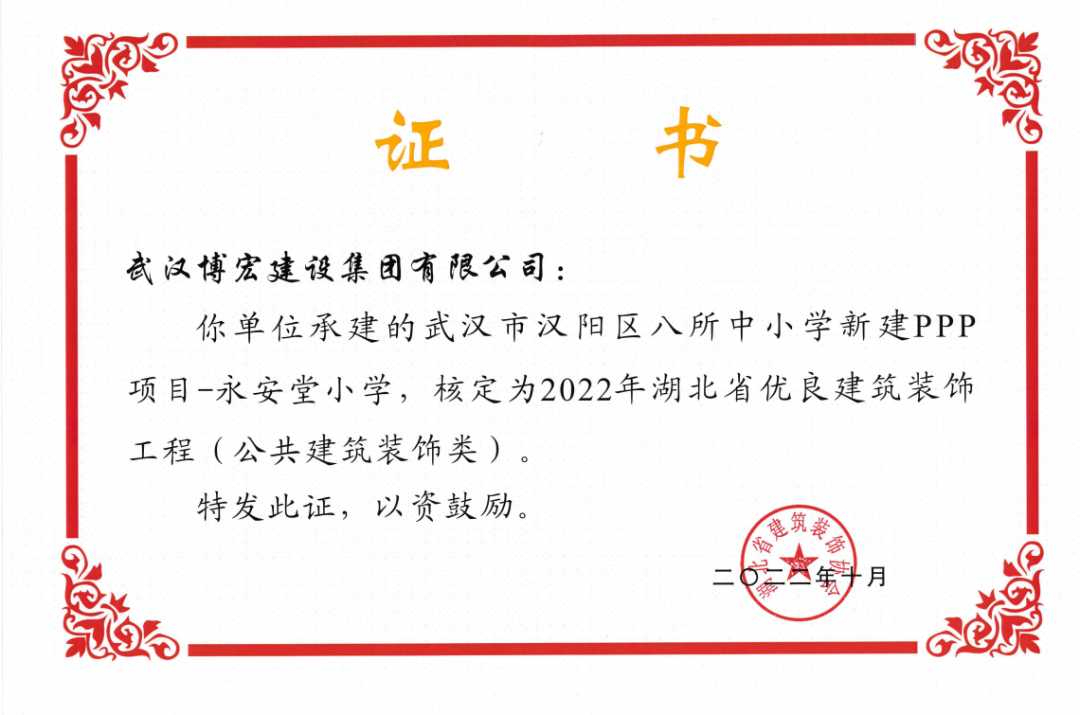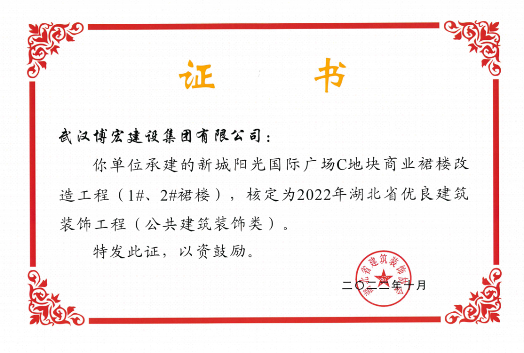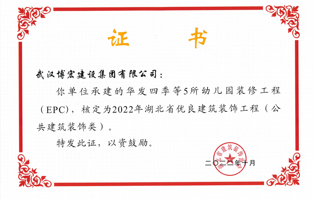 近日,湖北省建筑裝飾協(xié)會發(fā)布了《關(guān)于開展2022年湖北省建筑裝飾工程質(zhì)量目標(biāo)考核工作的通知》,由博宏建設(shè)集團承建的華發(fā)四季等5所幼兒園裝修工程(EPC)、新城陽光國際廣場C地塊商業(yè)裙樓改造工程(1#、2#裙樓)、新城陽光國際廣場D地塊商業(yè)裙樓改造工程(D座裙樓)、武漢市漢陽區(qū)八所中小學(xué)新建PPP項目-永安堂小學(xué)被核定為“2022年湖北省優(yōu)良建筑裝飾工程(公共建筑裝飾類)”。