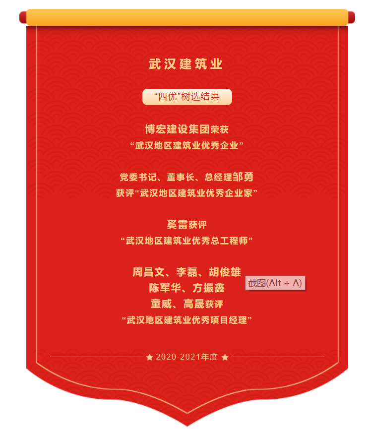 ? ? ? ? 近日,武漢建筑業(yè)協(xié)會(huì)發(fā)布2020-2021年度武漢地區(qū)建筑業(yè)優(yōu)秀企業(yè)、優(yōu)秀企業(yè)家、優(yōu)秀總工程師、優(yōu)秀項(xiàng)目經(jīng)理(以下稱為“四優(yōu)”)選樹結(jié)果。經(jīng)會(huì)員單位自主申報(bào)、協(xié)會(huì)組織專家評(píng)審、主管部門復(fù)核、武漢建協(xié)三季度會(huì)長(zhǎng)辦公會(huì)審議通過并在協(xié)會(huì)網(wǎng)站進(jìn)行公示,“四優(yōu)”選樹結(jié)果名單火熱出爐。博宏建設(shè)集團(tuán)榮獲“武漢地區(qū)建筑業(yè)優(yōu)秀企業(yè)”;黨委書記、董事長(zhǎng)、總經(jīng)理鄒勇獲評(píng)“武漢地區(qū)建筑業(yè)優(yōu)秀企業(yè)家”;奚雷獲評(píng)“武漢地區(qū)建筑業(yè)優(yōu)秀總工程師”;周昌文、李磊、胡俊雄、陳軍華、方振鑫、童威及高晟獲評(píng)“武漢地區(qū)建筑業(yè)優(yōu)秀項(xiàng)目經(jīng)理”。