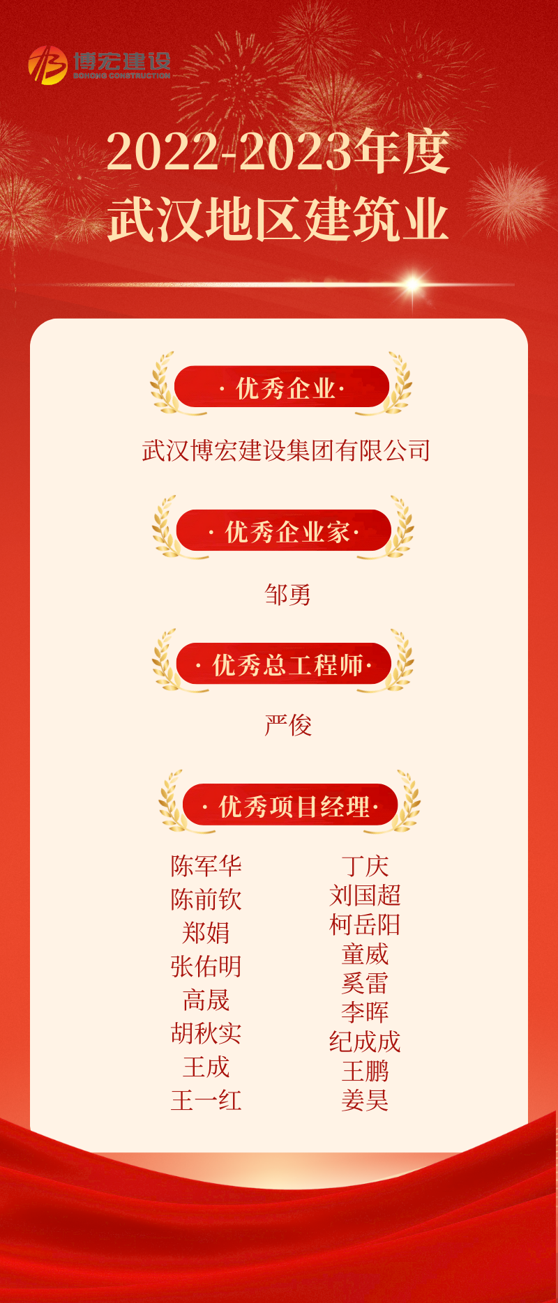 近日,2022-2023年度武漢地區(qū)建筑業(yè)優(yōu)秀企業(yè)、優(yōu)秀企業(yè)家、優(yōu)秀總工程師、優(yōu)秀項目經(jīng)理選樹結(jié)果正式發(fā)布,博宏建設(shè)集團(tuán)喜獲“大豐收”,獲評1項優(yōu)秀企業(yè)、1人獲評優(yōu)秀企業(yè)家、1人獲評優(yōu)秀總工程師、17人獲評優(yōu)秀項目經(jīng)理!